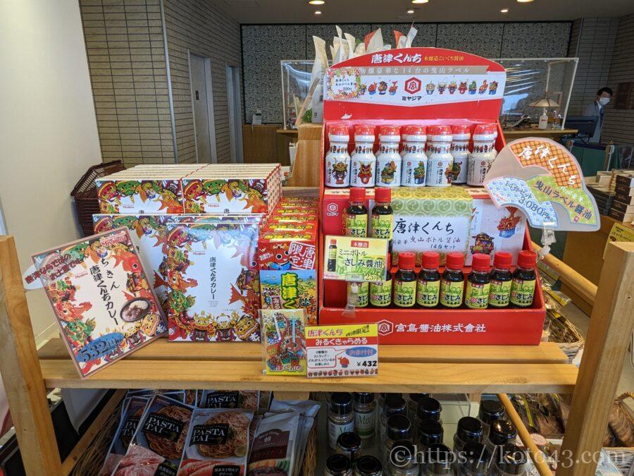 フロント前にある売店はコンパクトながらもお土産の種類が豊富。唐津くんちコラボの商品がかわいくてお土産に購入しました。