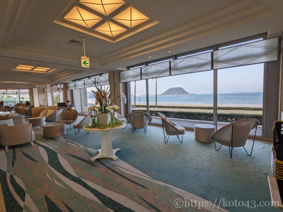 横方向に広いロビーからは唐津湾と高島を一望でき、和の要素もある内装はしっとりとした雰囲気です。