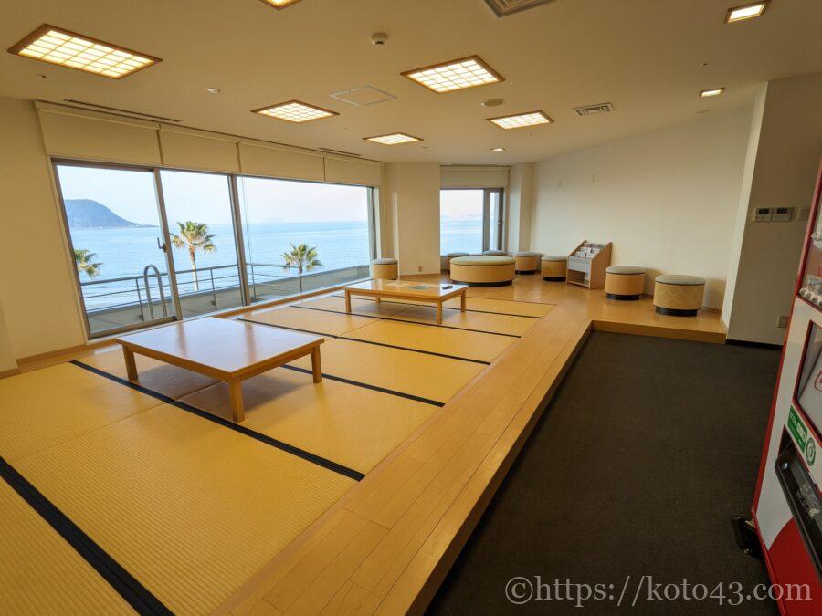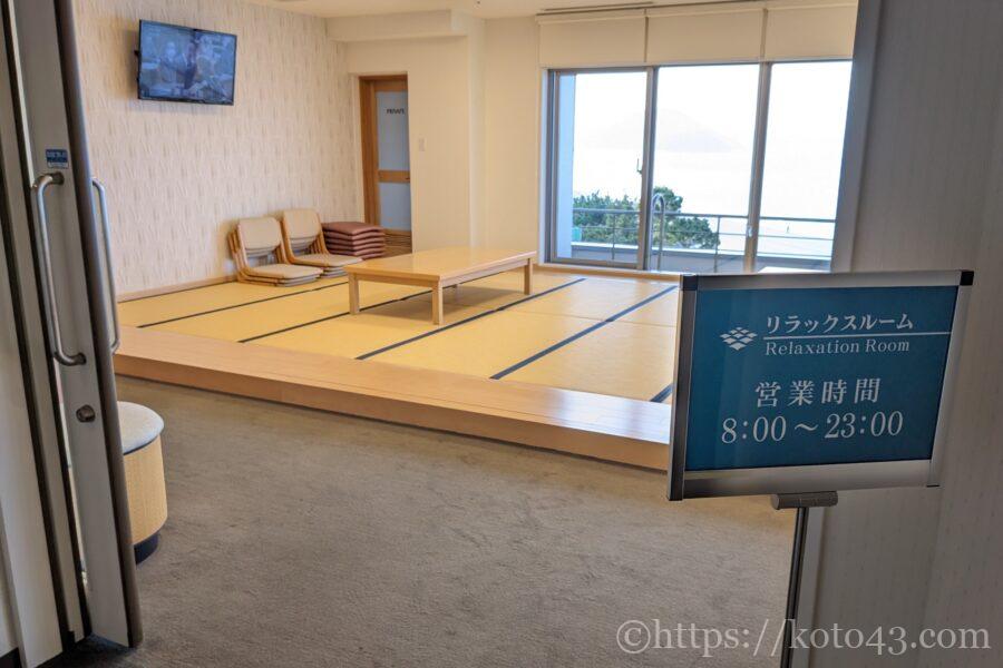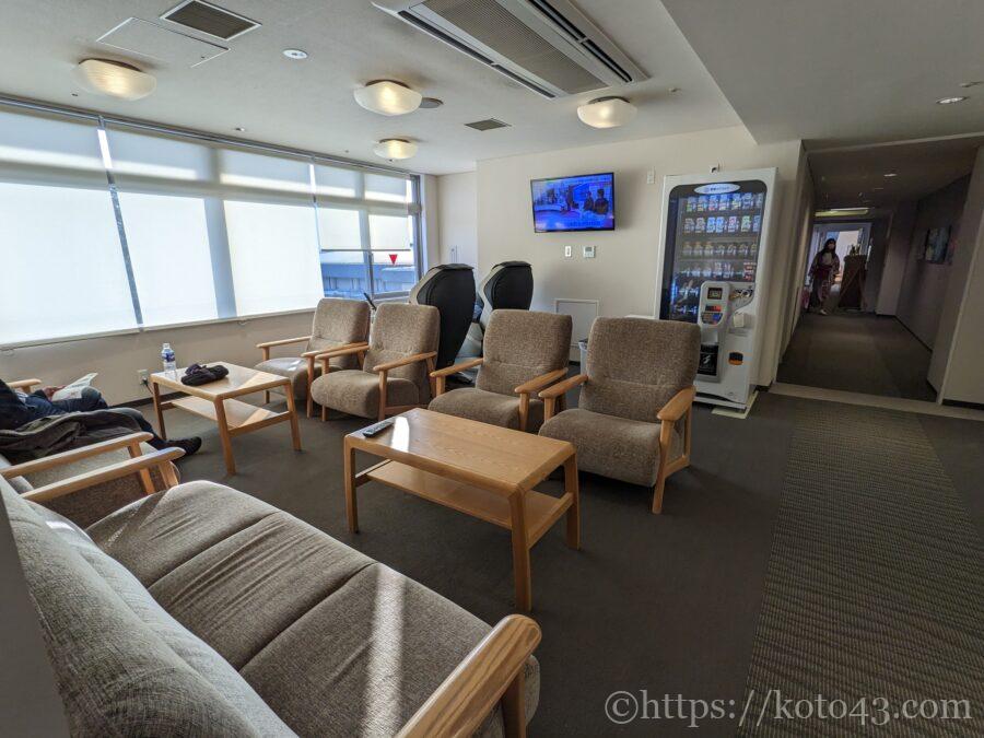 大浴場の前にマッサージチェアがある休憩スペースと、エレベーター奥には小上がりのリラックスルームがありました。