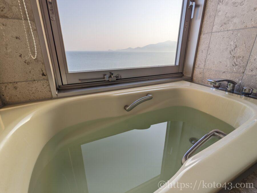 大浴場に行けないときでも温泉気分を味わえる、海が見える客室風呂も嬉しいポイント。