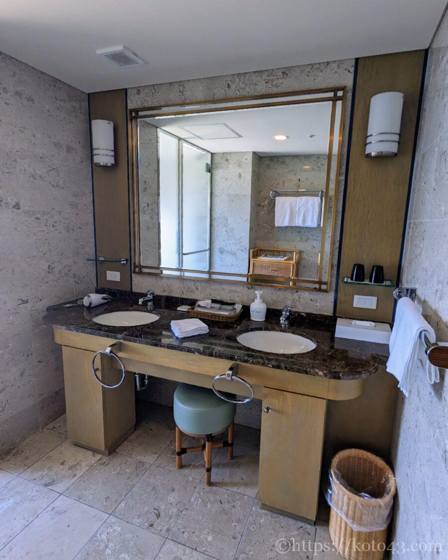 広々とした脱衣所に大きな鏡と洗面台。洗面ボウルが2つあるのがうれしい。