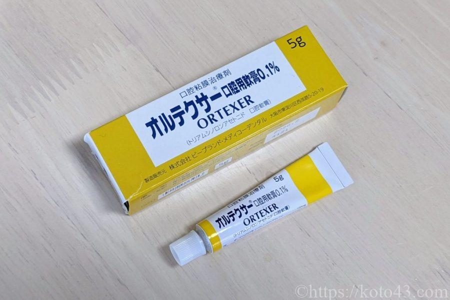 口内炎があるときに歯医者さんの定期健診を受けたので相談してみたところ「オルテクサー 口腔用軟膏0.1%」という薬を処方してくれました。透明がかった軟膏で、1日数回患部に塗布します。